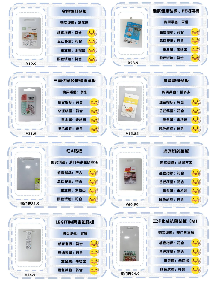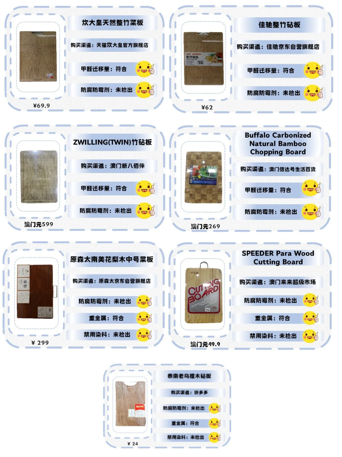 7款竹、木砧板中六种防腐防霉剂均未检出; 4款竹砧板甲醛迁移量测试均符合标准要求; 重金属和初级芳香胺指标均符合标准要求; 8款塑料砧板的感官指标均符合要求,理化性能均符合标准要求。