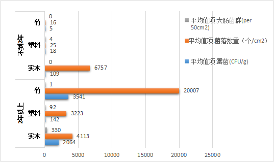 三种材质的旧砧板均未检出四种常见的致病菌(沙门氏菌、志贺氏菌、金黄色葡萄球菌、溶血性链球菌); 使用了2年以上的砧板在菌落总数、霉菌和大肠菌群数相比不到2年的明显要更多。 ▲ 旧砧板霉菌、大肠菌群、菌落总数2年以上和不到2年对比 (由于样本量有限,仅供参考)